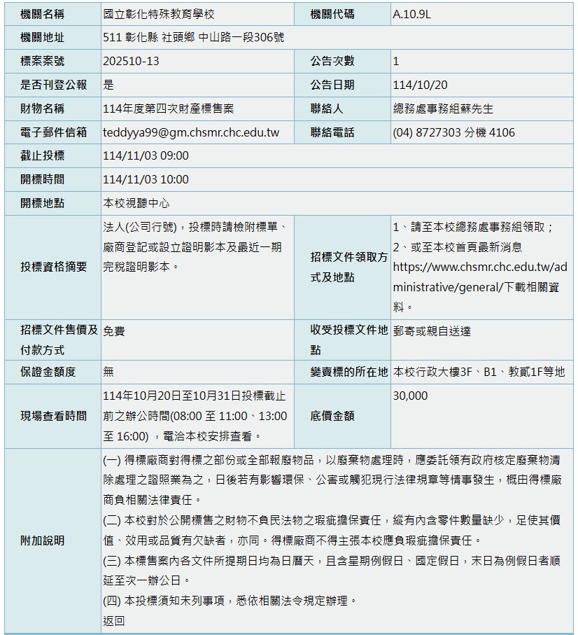 Post author:chsmrchc046 Post last modified:2025/10/20 Post category:總務處 本校「114年度第四次財產標售案」相關文件 1.招標公告下載 2.投標須知下載 3.變賣清冊下載 4.契約下載 5.切結書下載 6.標單下載 7.標封面下載 8.委託代理授權下載 Post Views: 104 Read more articles 上一篇文章無障礙校園環境諮詢小組作業要點1140121下一篇文章校園城鎮韌性(防空)疏散避難 演練 參考 指引 (114)