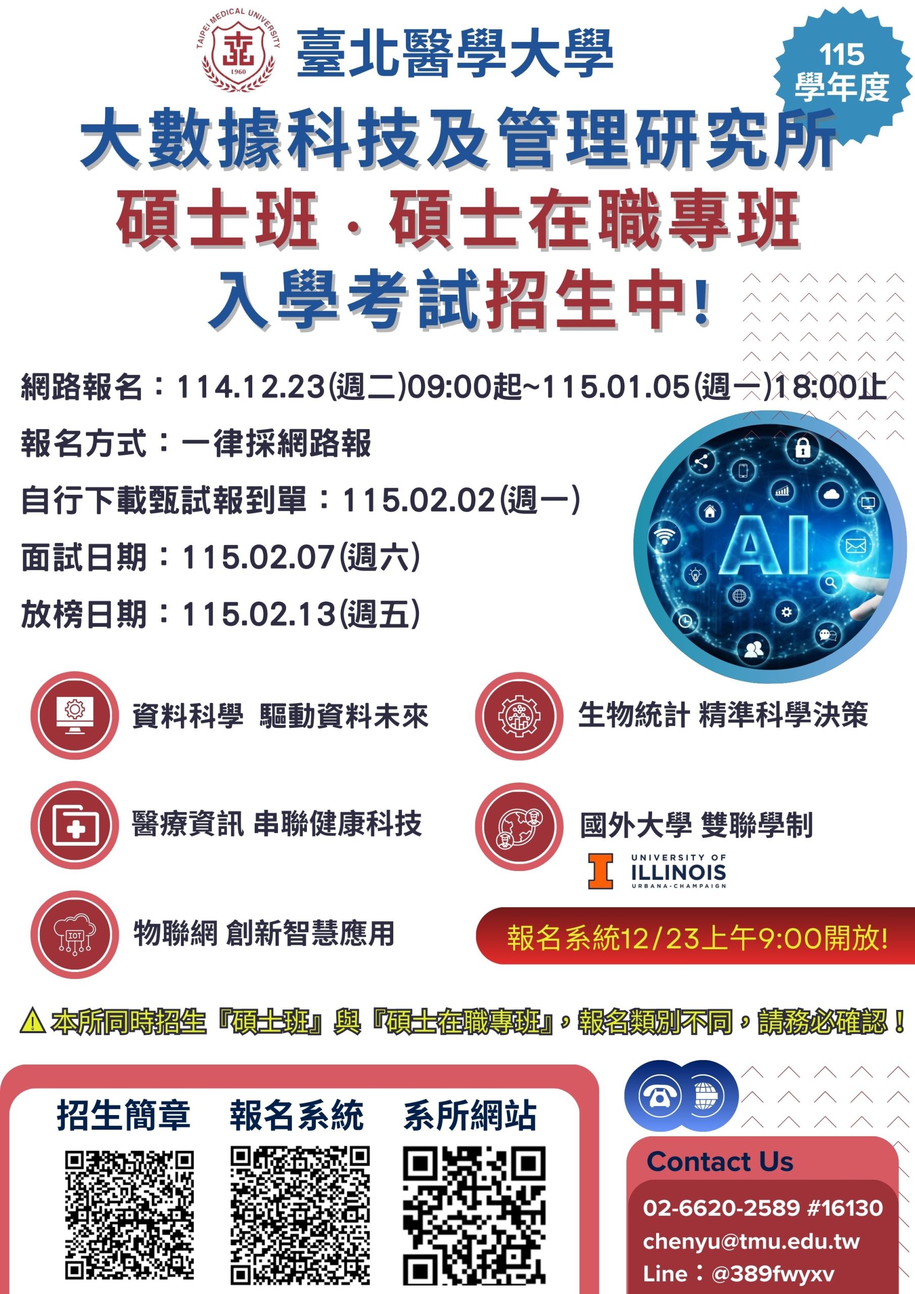 Post author:chsmrchc028 Post last modified:2025/12/29 Post category:一般公告 / 人事室 轉知-臺北醫學大學大數據科技及管理研究所碩士班碩士在職專班115學年度入學招生中 臺北醫學大學函下載 臺北醫學大學碩士班暨碩士在職專班115招生簡章下載 大數據科技及管理研究所碩士班招生海報下載 Post Views: 11 Read more articles 上一篇文章公務人員保障暨培訓委員會訂定「機關發生重大災害或死亡安全衛生事故審議小組作業要點」,並自115年1月9日生效下一篇文章轉知-考試院會同行政院114年12月4日修正發布之各機關職稱及官等職等員額配置準則修正條文、總說明及條文對照表